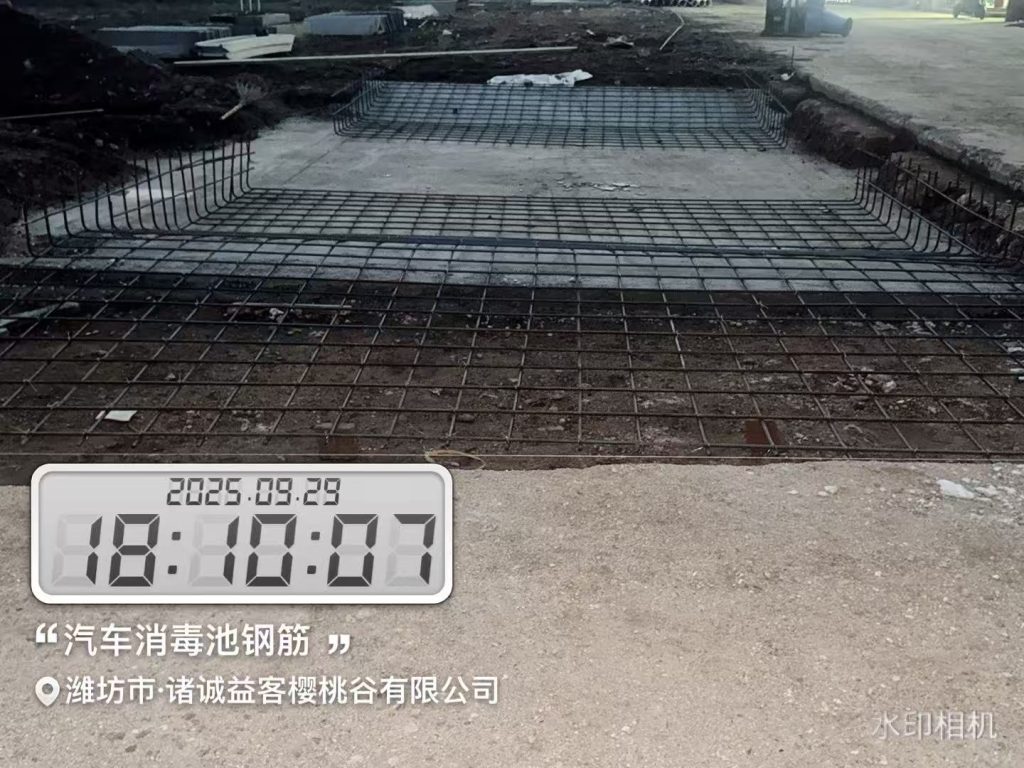 1、大门口车辆消毒池绑扎钢筋。 2、厂区