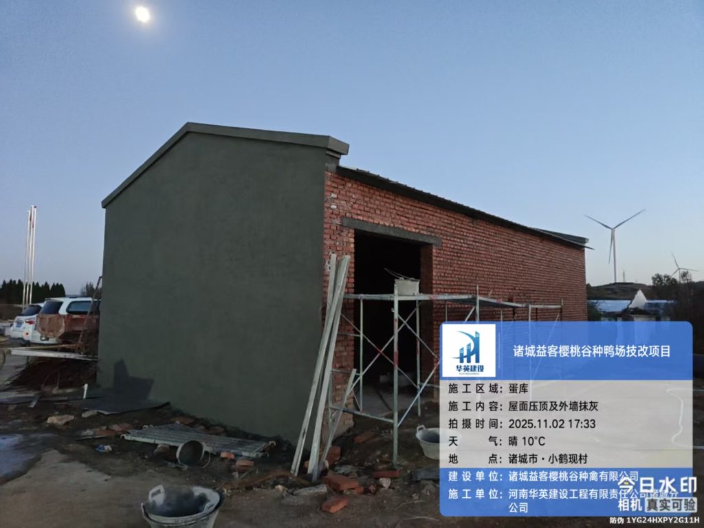 1、蛋库外墙抹灰完成。 2、稻壳库西场地