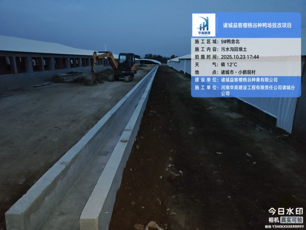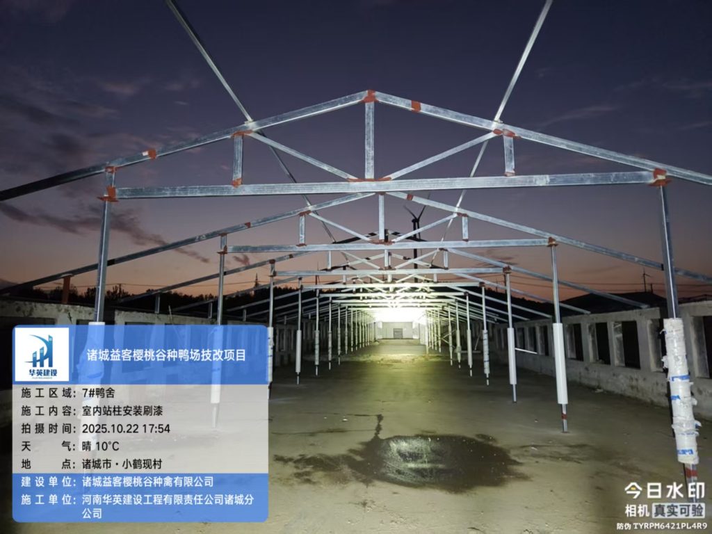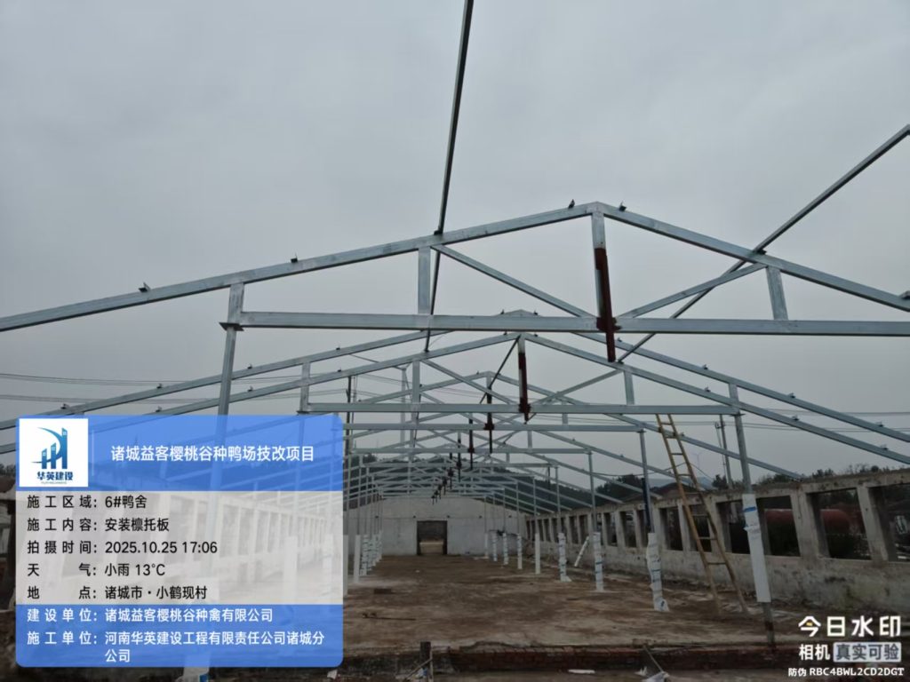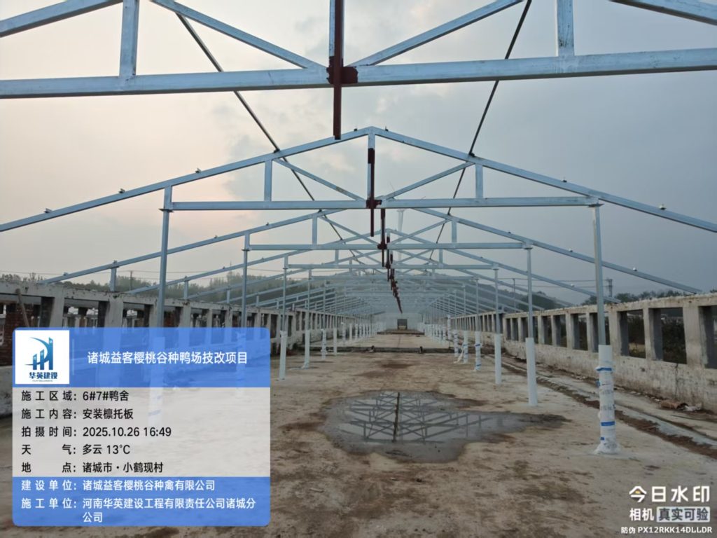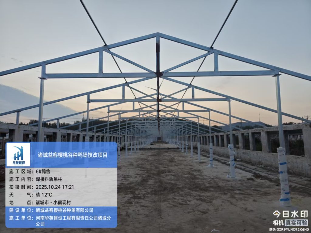 1、6#鸭舍焊接安装檩托板。 2、焊接制作二期鸭舍钢梁。 3、5#鸭舍开挖饮水岛基础。 4、西侧集粪池东过路污水沟支模浇筑。